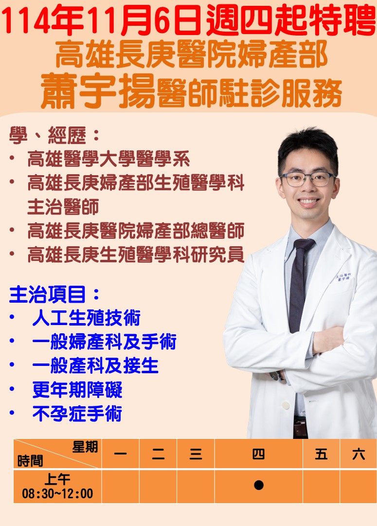 114年11月6日起,特聘高雄長庚婦產部消與揚醫師週四上午駐診服務,歡迎民眾善加使用!