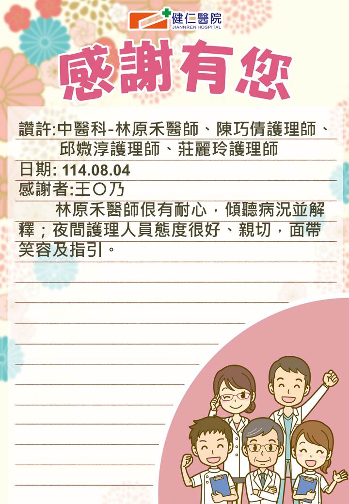- 感謝園地 讚許事件-中醫科林原禾醫師、護理師