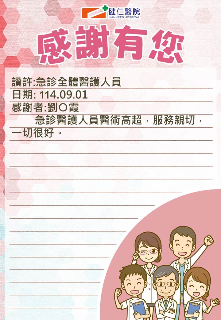 - 感謝園地 讚許事件-小兒暨風濕免疫科劉家嘉醫師、掛批組洪郁琳辦事員
