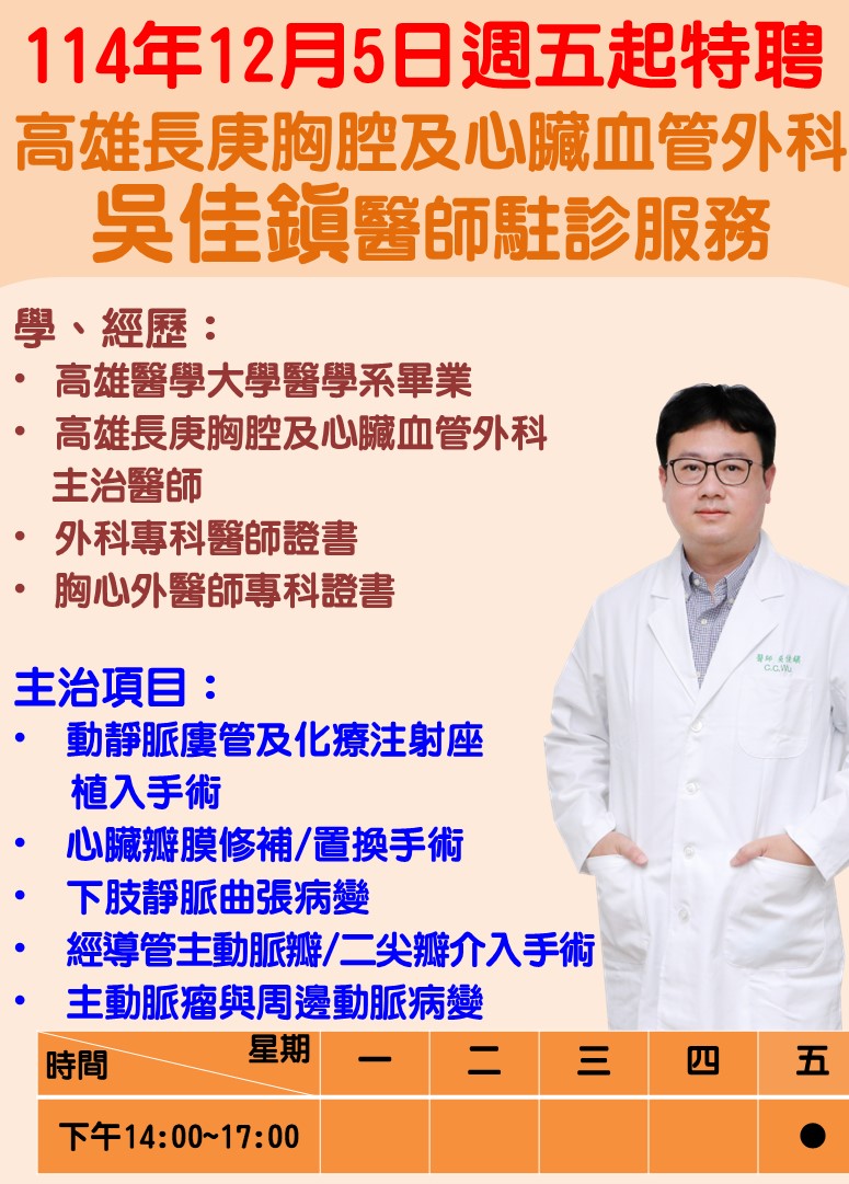 114年12月5日週五起!特聘請高雄長庚胸腔及心臟血管外科『吳佳鎮醫師』於本院駐診服務~~