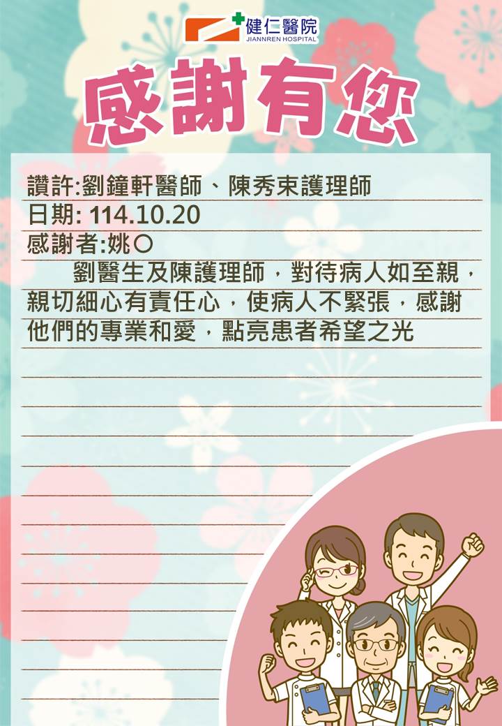 - 感謝園地 讚許事件-小兒暨風濕免疫科劉家嘉醫師、掛批組洪郁琳辦事員