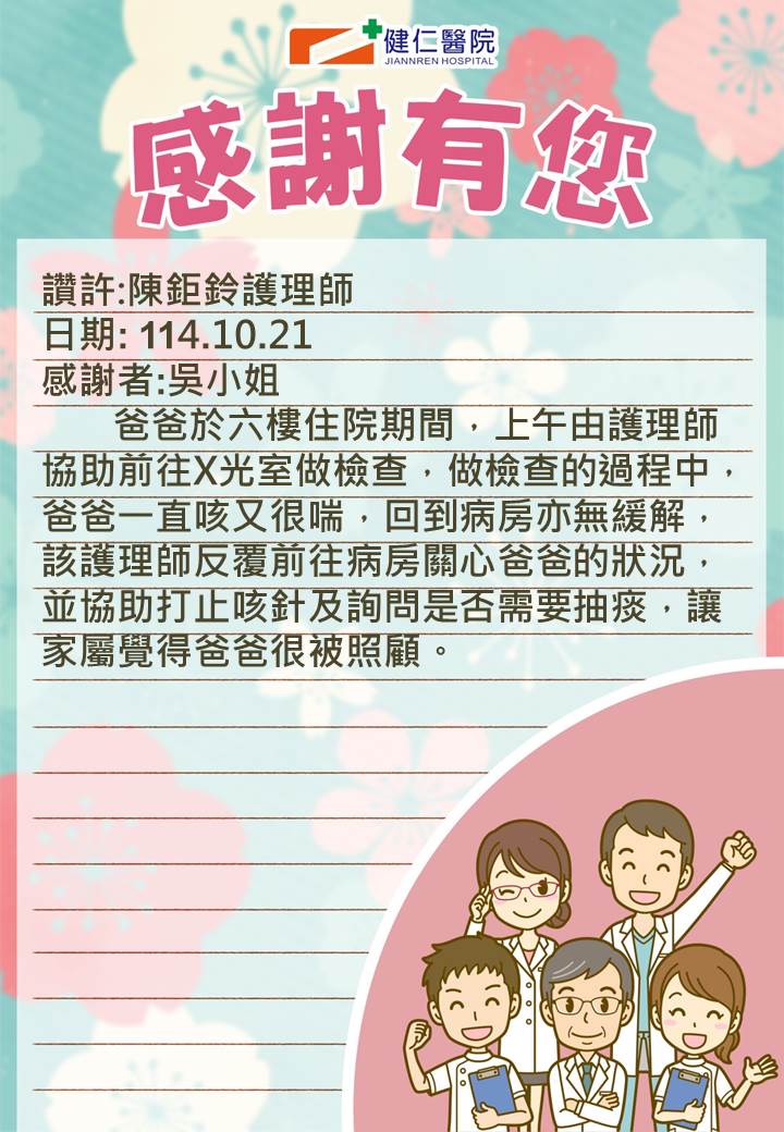 - 感謝園地 讚許事件-6樓病房陳鉅鈴護理師