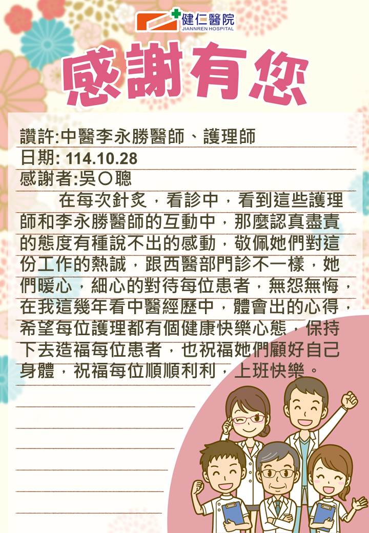 - 感謝園地 讚許事件-中醫科李永勝醫師、掛批李怡葶小姐