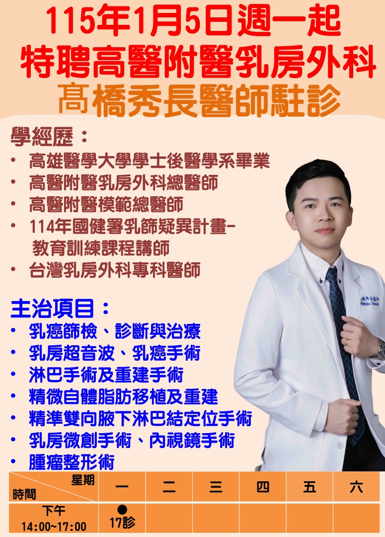 - 新進醫師 【新進醫師】115年1月5日起,特聘請高醫附醫乳房外科髙橋秀長醫師於本院駐診服務~