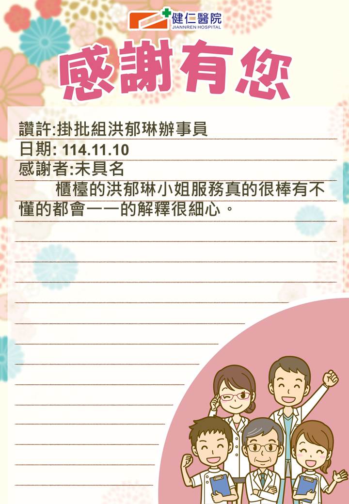- 感謝園地 讚許事件-小兒暨風濕免疫科劉家嘉醫師、掛批組洪郁琳辦事員