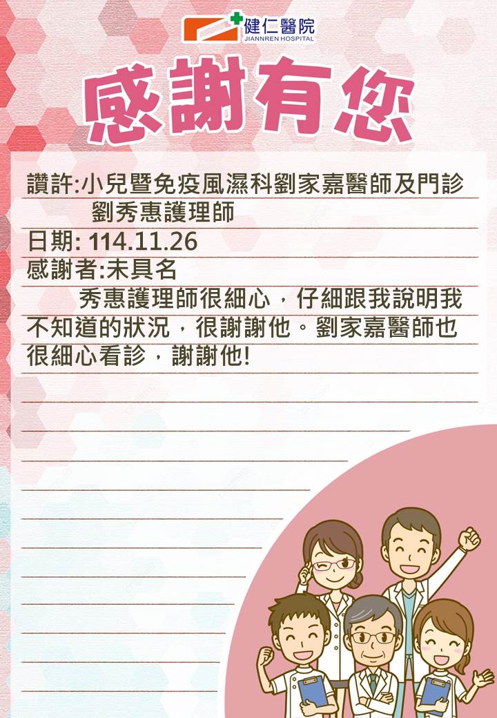 讚許事件-小兒暨風濕免疫科劉家嘉醫師、門診劉秀惠護理師