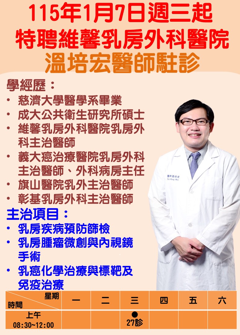 - 新進醫師 115年1月7日起,特聘請維馨乳房外科醫院溫培宏醫師於本院駐診服務~