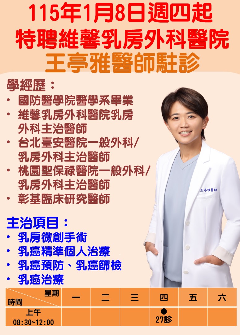 - 新進醫師 115年1月8日起,特聘請維馨乳房外科醫院王亭雅醫師於本院駐診服務~