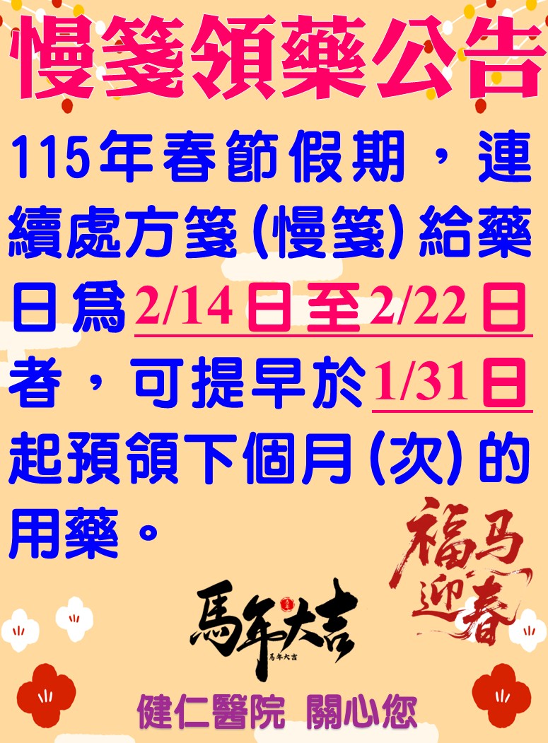 - 最新消息 【春節】連續處方箋(慢箋)領藥公告