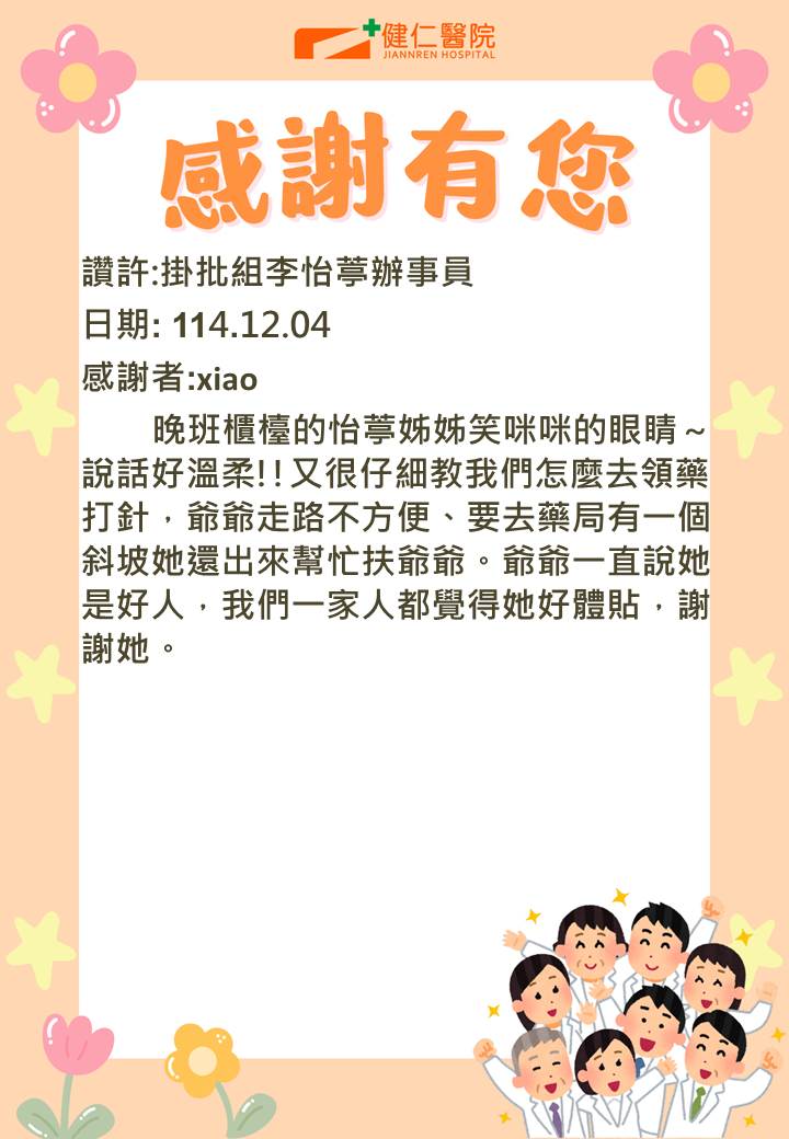 - 感謝園地 讚許事件-批價組李怡葶辦事員、體檢室護理師
