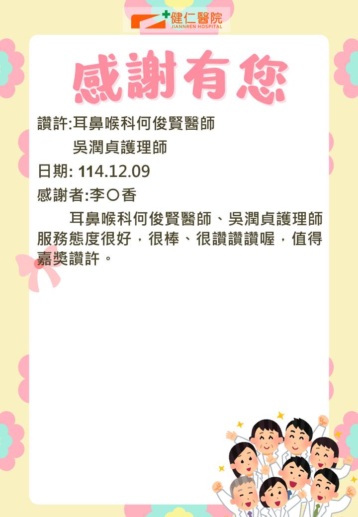- 感謝園地 讚許事件-耳鼻喉科何俊賢醫師、門診吳潤貞護理師