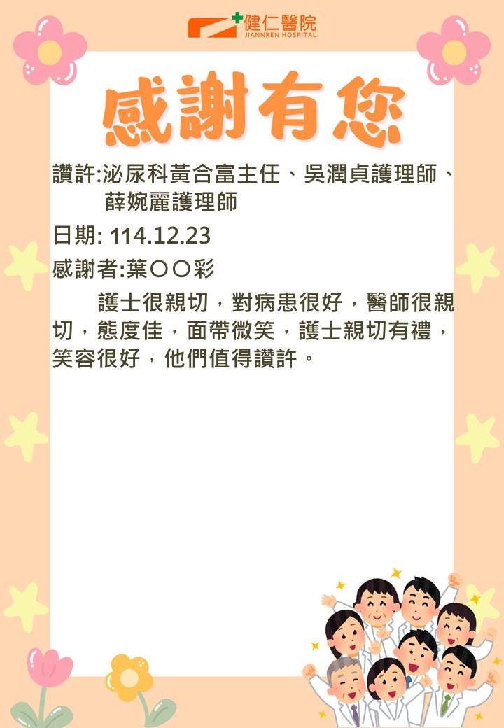 - 感謝園地 讚許事件-泌尿科黃合富主任、門診吳潤貞、薛婉麗護理師