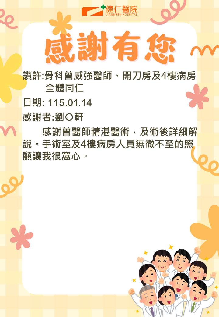 - 感謝園地 讚許事件-骨科曾威強醫師、開刀房及4樓病房護理人員