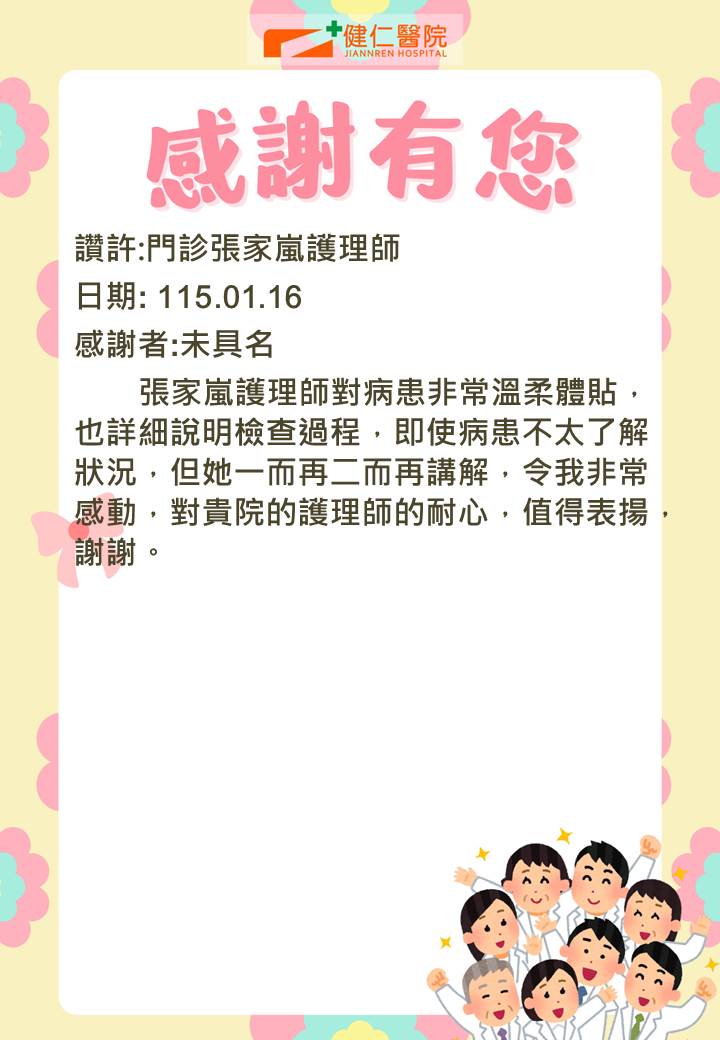 - 感謝園地 讚許事件-門診張家嵐護理師