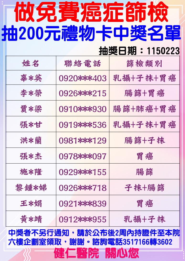 - 最新消息 115年1月做癌篩抽200元禮物卡中獎名單