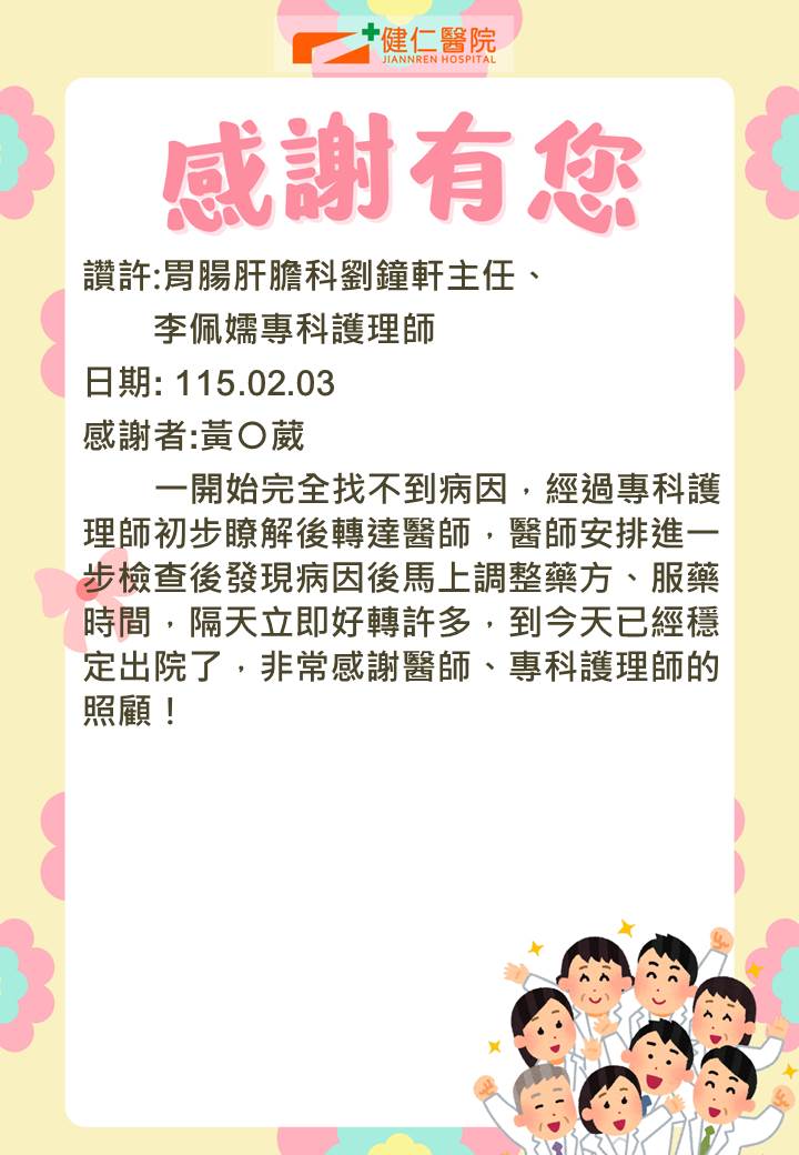 - 感謝園地 讚許事件-胃腸科劉鐘軒醫師、門診全體人員