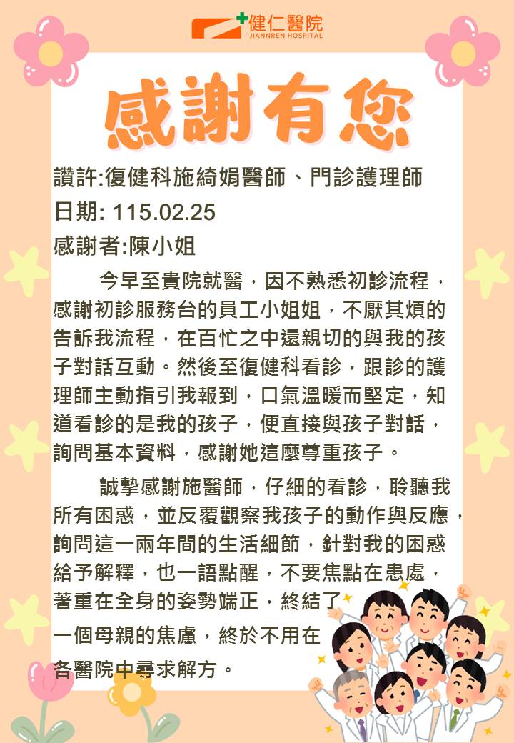 - 感謝園地 讚許事件-復健科施綺娟醫師、門診護理師
