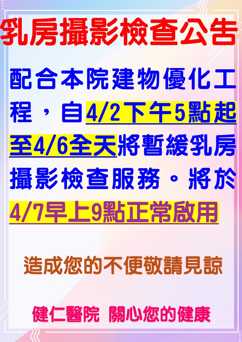 - 最新消息 115年4/2下午5點起至4/6乳攝服務暫緩